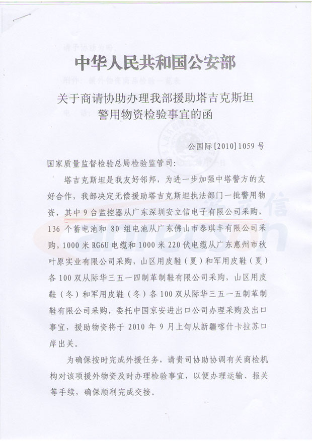 2010年9月 國際在線消息 “中華人民共和國公安部援助塔吉克斯坦警用物資交接儀式”13日在中塔邊境卡拉蘇口岸舉行,新疆紅其